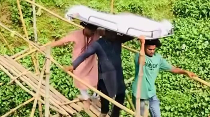 তিন যুবক একটি মরদেহ মাথায় নিয়ে বাঁশের সাঁকো পর হচ্ছেন। পেছন থেকে স্বজনরা কালেমা শাহাদাত পড়ছেন। তাদের মুহূর্তের অসাবধানতায় ঘটে যেতে পারে বড় দুর্ঘটনা। এমন একটি ভিডিও শনিবার সামাজিক যোগাযোগমাধ্যমে